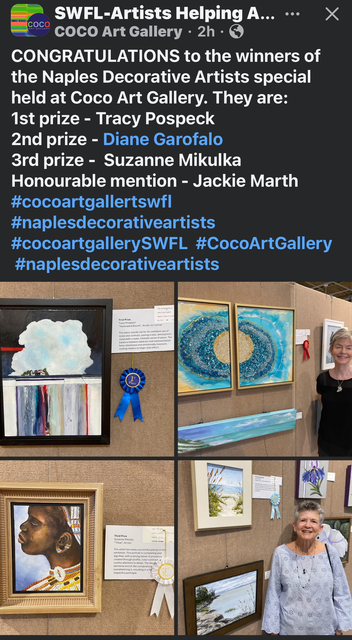 Exciting News- we would like to congratulate all of our artists who contributed to our Special Exhibit at Coco Gallery in Estero this January 2026. This exhibit is open to all throughout the month of January. Coco Gallery is located in Coconut Point near Panera. In addition, arrangements were made for all the pieces to be reviewed, and 4 awards were given out. Congratulations to all! The Awards went to Tracy Pospeck, first place; Diane Garofalo, second place; Suzanne Mikulka, third place; and Jackie Marth, honorable mention. The Judging was done by FGCU professor who looked at many criteria, the main one considered was design. As you review the selections, read the comment cards.